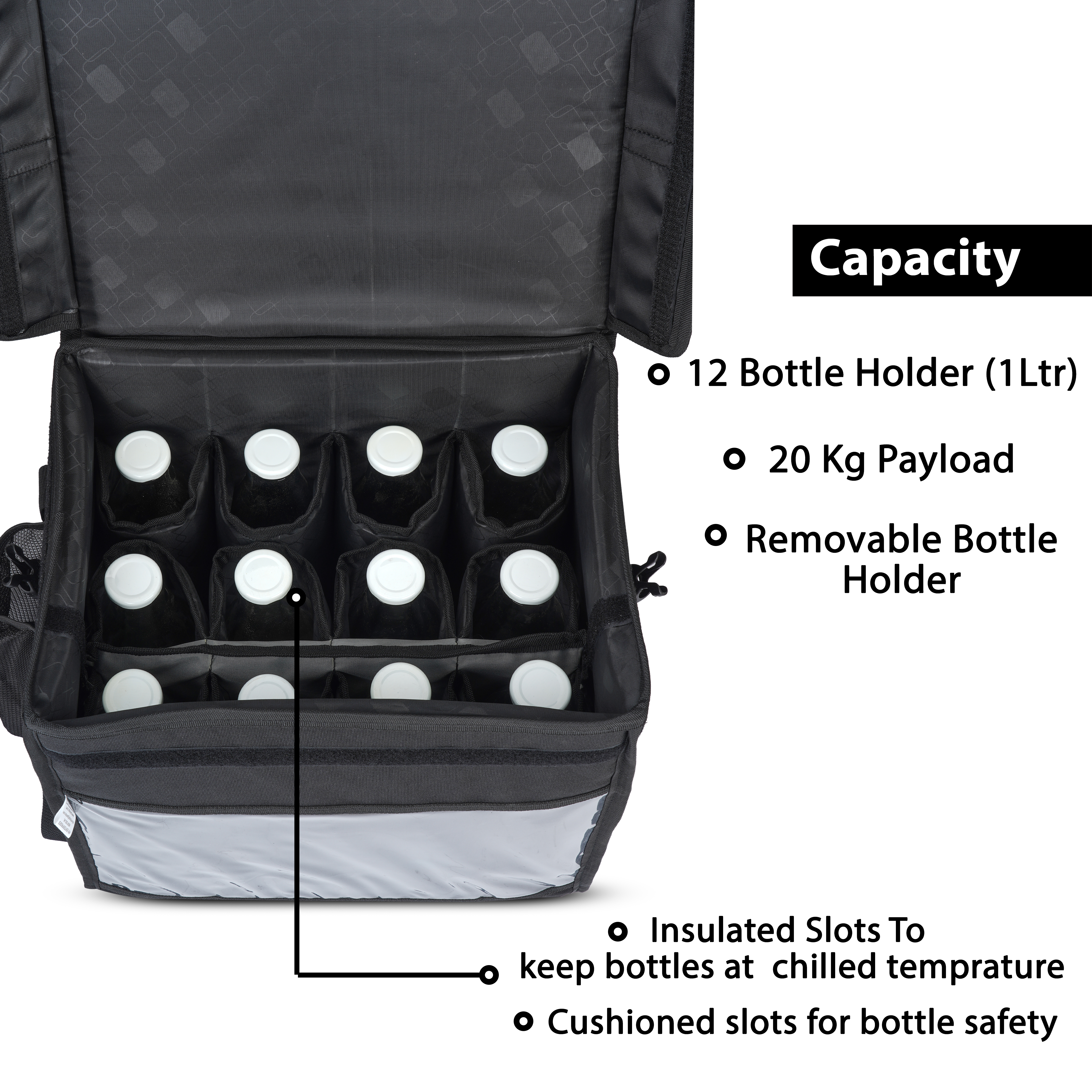 Packpr 12 glass bottle capacity of 1 ltr Heavy duty pvc coated fabric Heavy duty insulated inner lining Nylon heavy straps Velcro and Pushclip are given to close Particular slot for particular bottle Insulated and waterproof