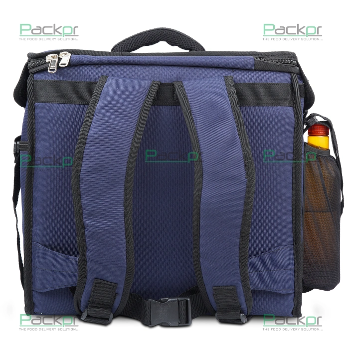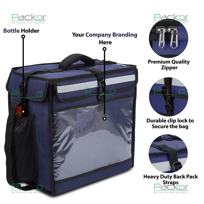 It's size is 16x16x10 inch. The bag can be collapse to reduce the volume which helps in low shipping cost. Well designed to keep food at their temperature , introduced silver lining inside with EPE insulation in wall which makes insulation superior. The bag has very well cushioned backpack and a handle on top as well for carrying this. The one side of the bag has a bottle holder for rider / delivery boy and other witch a pocket to keep bills or documents. the reflective strip on the back closure glow with bright reflection when came in contact with light source in dark night it helps to identify and locate the delivery boy on road, hence play a safety role for the rider. Other things like fabric and plastic parts are provided of good quality which makes the life longer of the bag.