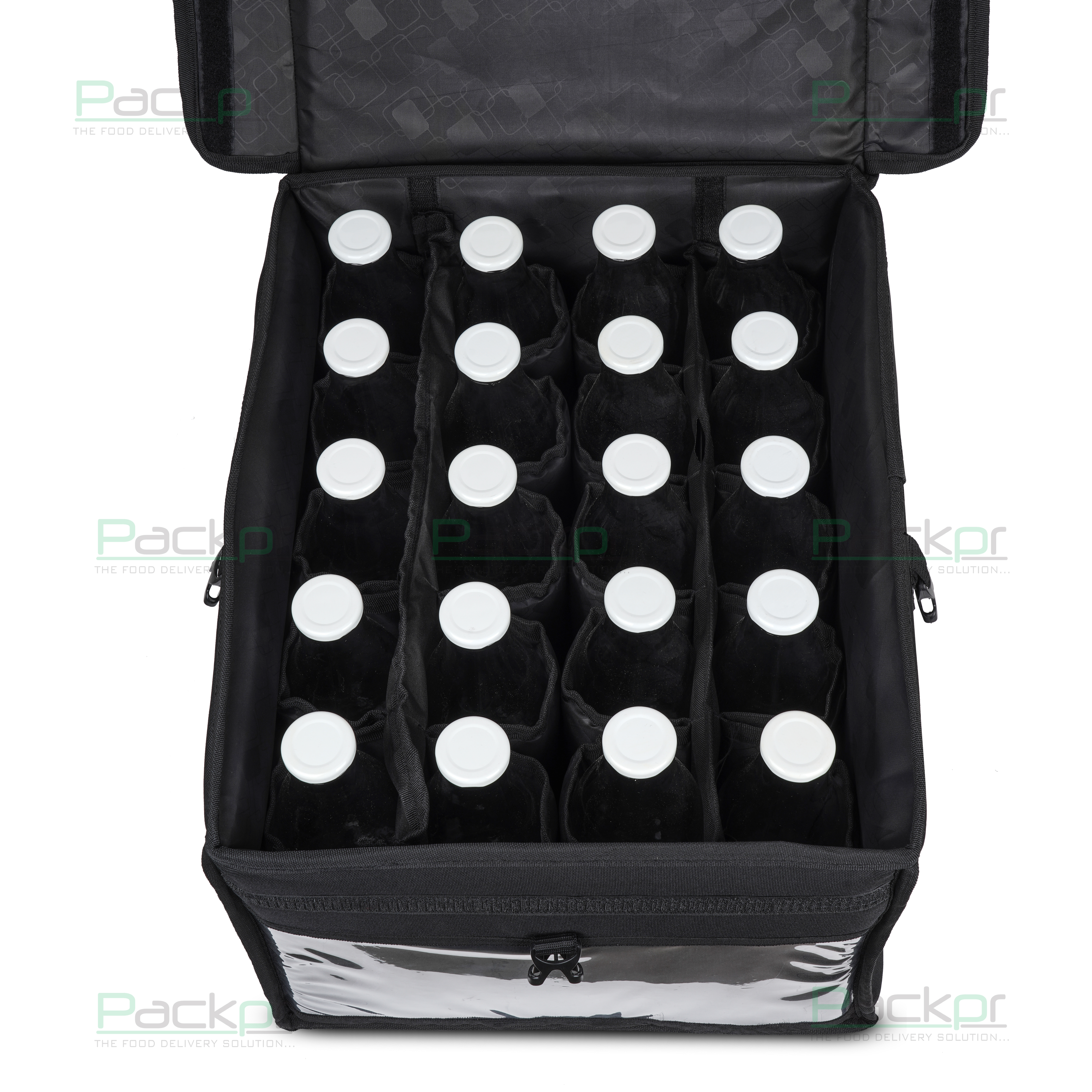 Packpr 20 glass bottle capacity of 1 ltr Heavy duty pvc coated fabric Heavy duty insulated inner lining Nylon heavy straps Velcro and Pushclip are given to close Particular slot for particular bottle Insulated and waterproof